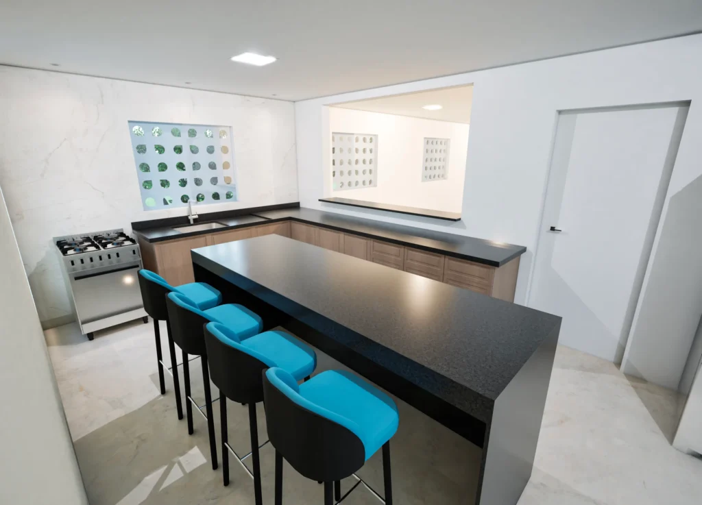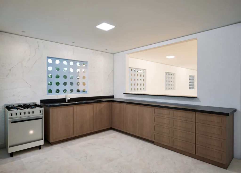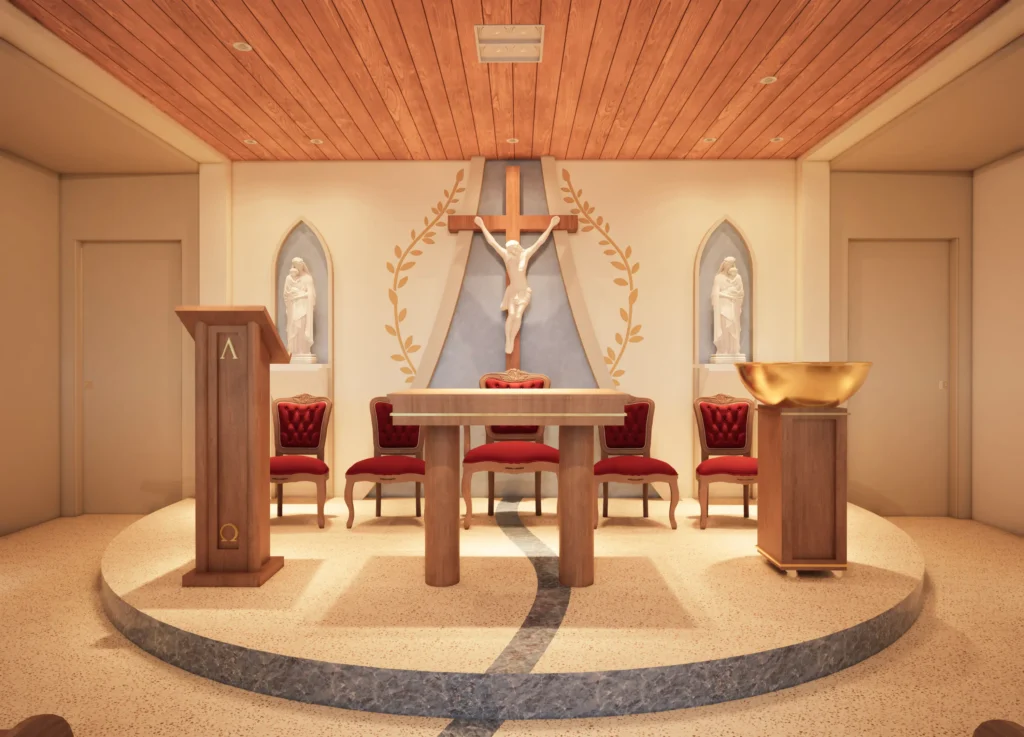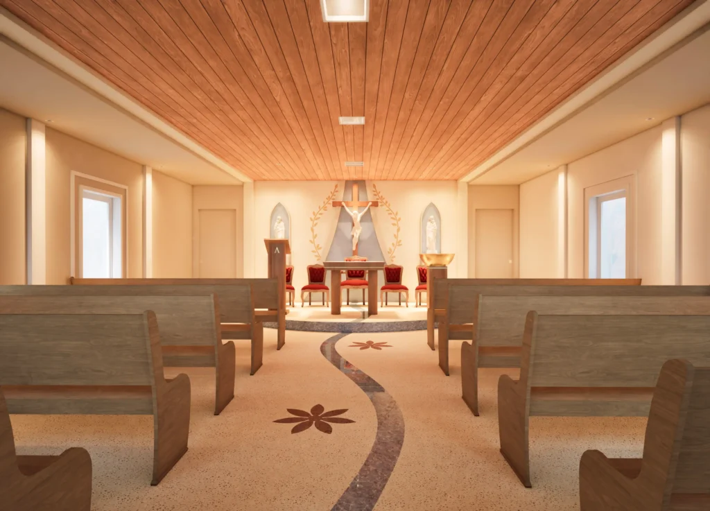 A madeira, as texturas suaves e os símbolos escolhidos compõem um ambiente simples, mas cheio de vida e significado. O altar leve para não pesar no ambiente. A cor azul para os detalhes foi escolhida por já fazer parte da identidade da capela anterior. Os nichos para os Santos de devoção da comunidade. A madeira no teto usada como condução para o mistério. Tudo se conecta. Tudo fala. Tudo acolhe.