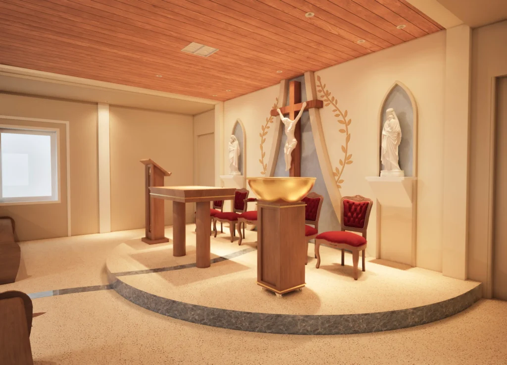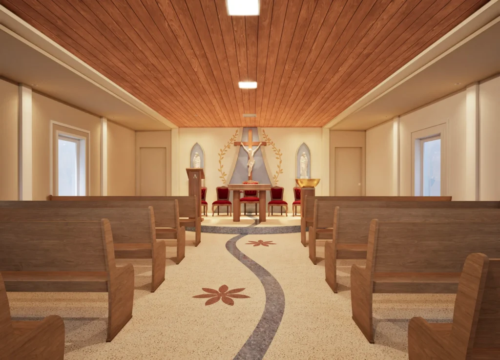 🎨 E um detalhe importante: os desenhos do piso e do presbitério conversam com a fachada da capela, criando harmonia entre o exterior e o interior.