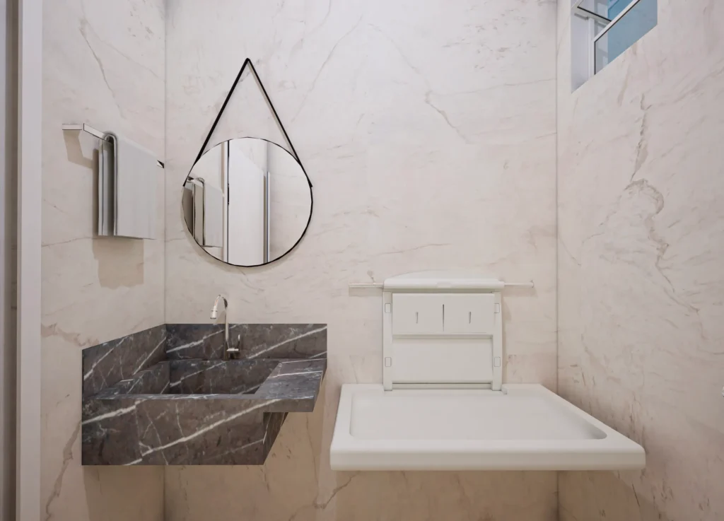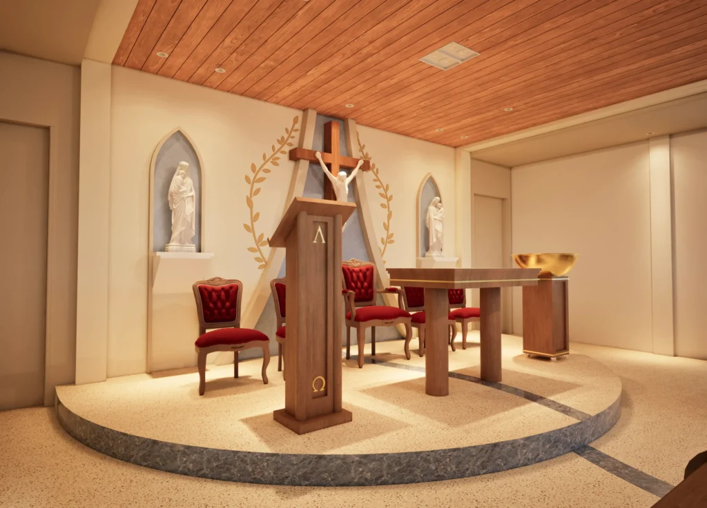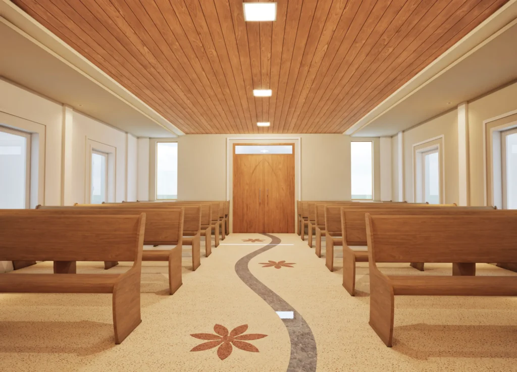 A verticalidade da fachada remete ao desejo humano de se elevar ao divino. O layout interno foi desenhado para favorecer a circulação e criar uma conexão fluida entre os espaços litúrgicos. A escolha dos materiais reforça a leveza e a dignidade do ambiente, valorizando a luz natural e o acolhimento.