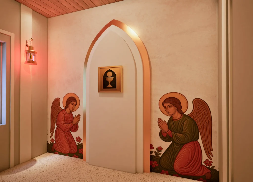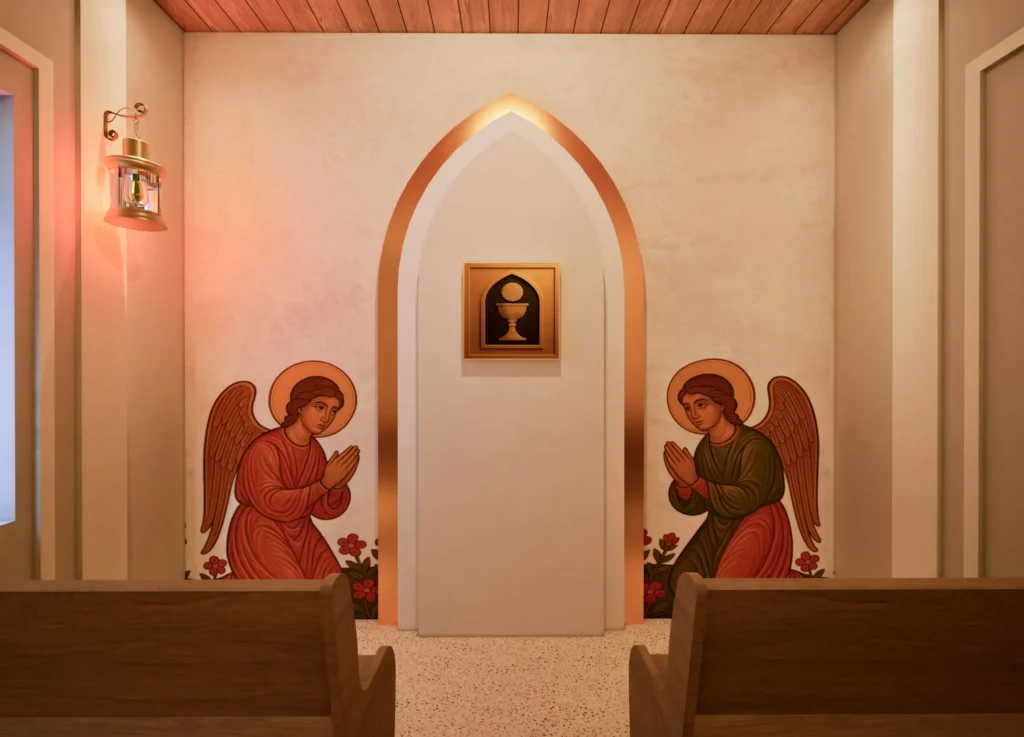 🕊️ A sala do Santíssimo foi projetada de forma reservada, oferecendo silêncio e recolhimento, um espaço íntimo de encontro com o Sagrado.